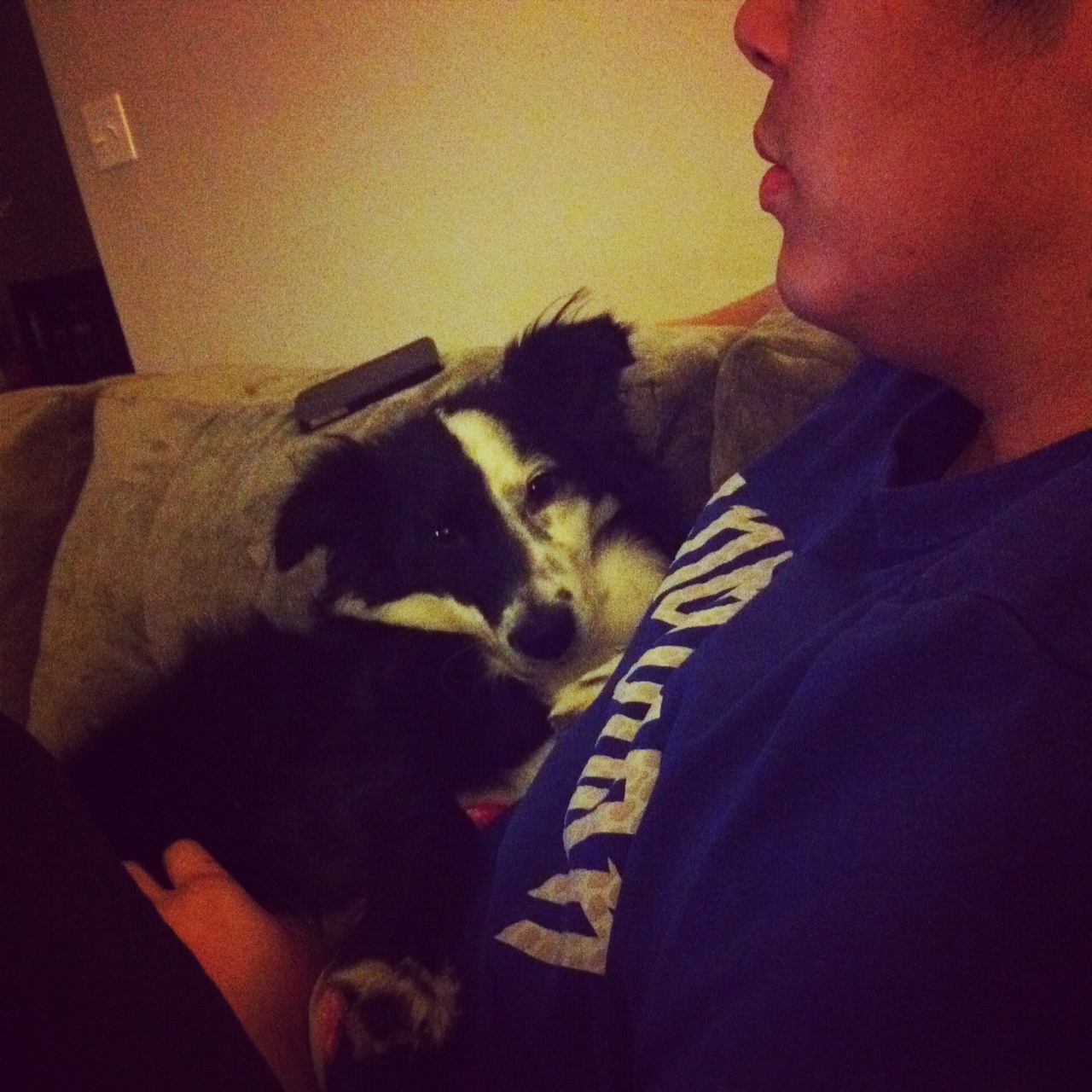 This is Khloe the pup and her dad when I get home from work. I now know why she thinks she is a baby. Her doggy dad treats her like a baby and coddles her. Aw how can you not love these two?!?